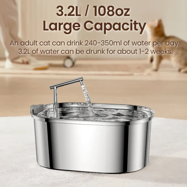 Our cat water dispenser has a large capacity and can hold 3L of water. By filling once, refilling is not required for several days
